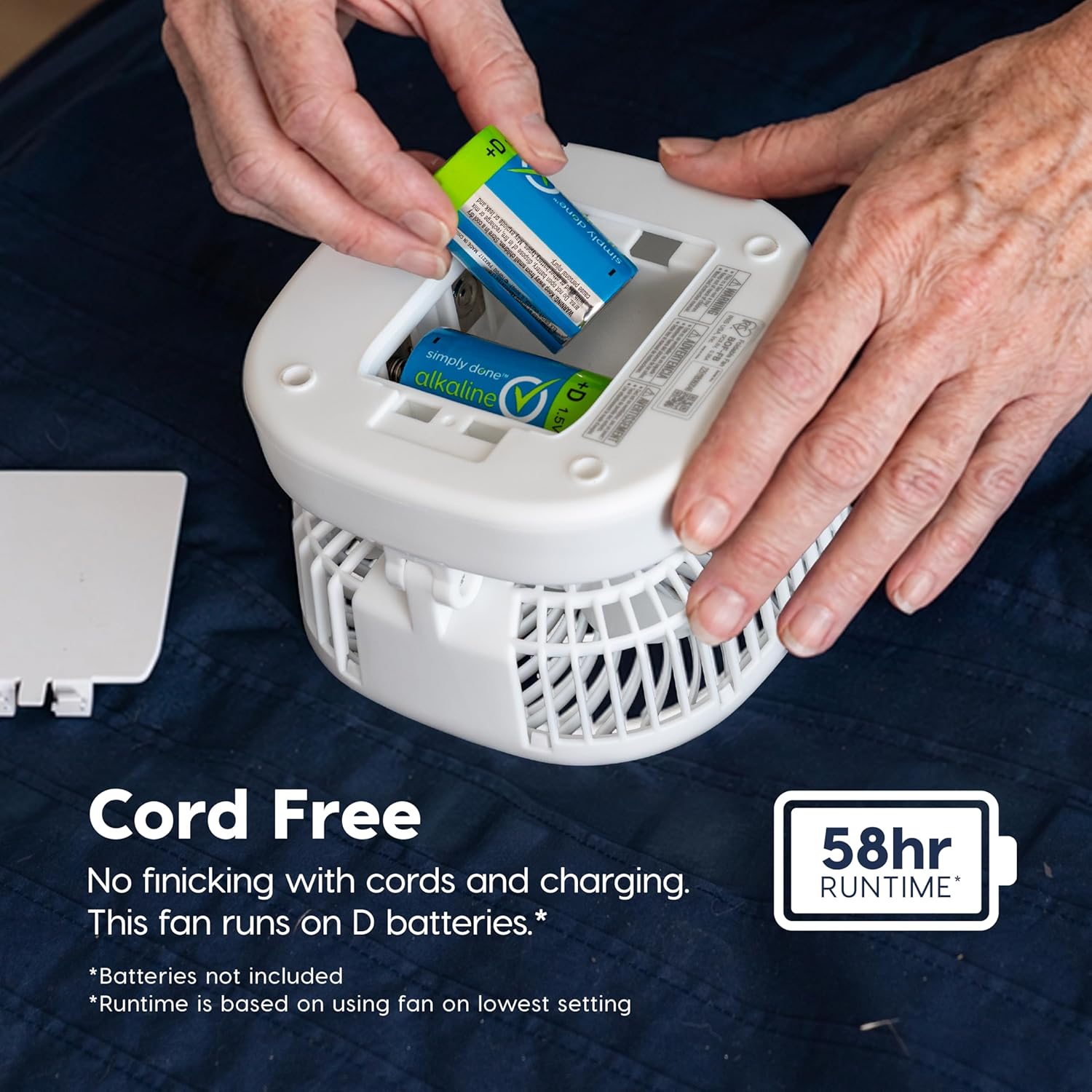 BATTERY OPERATED: Operates on two D-type batteries (not included) and delivers up to 58 hours of runtime on the lowest setting, providing dependable airflow without the need for cords or outlets.